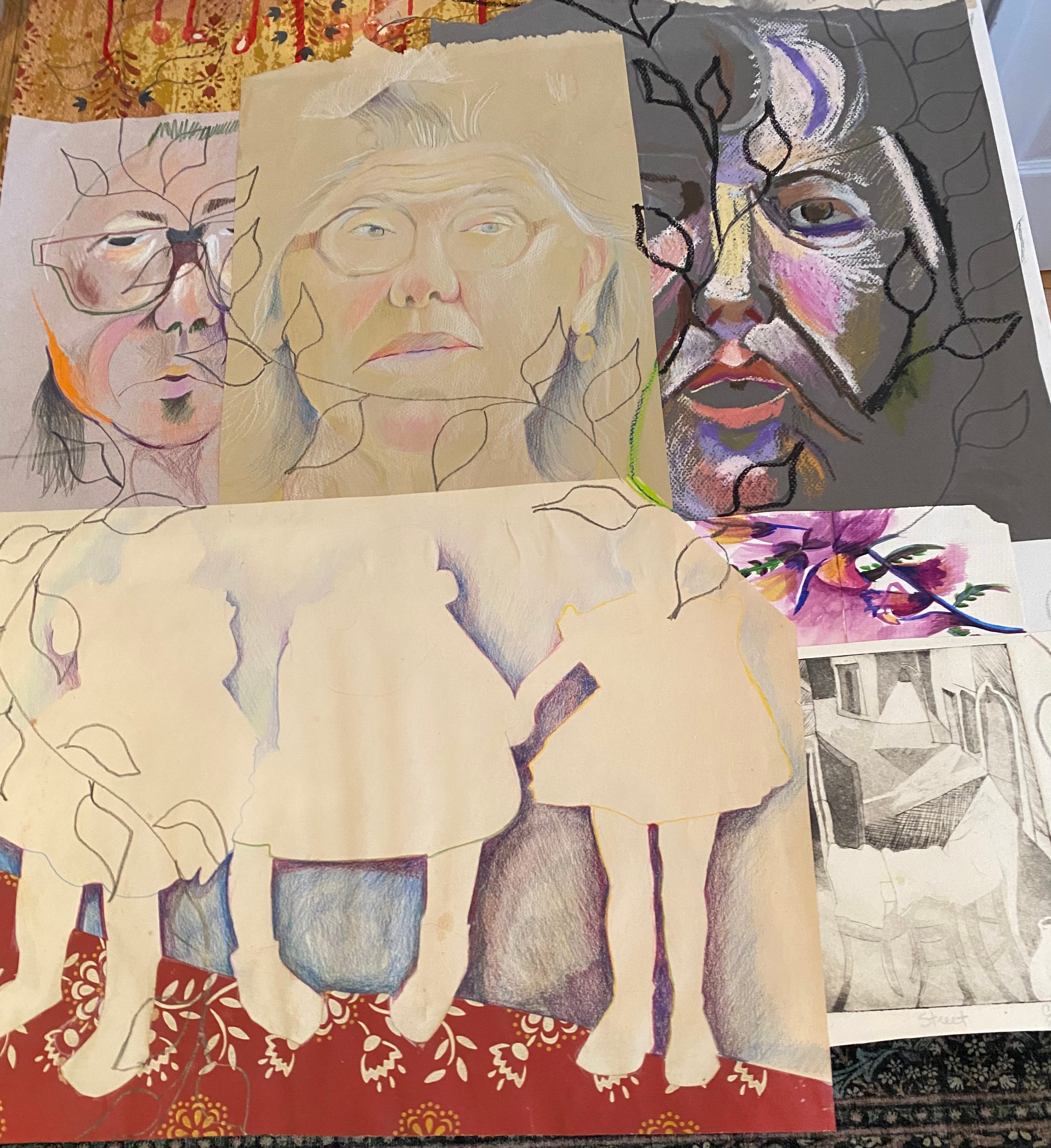 A couple weeks ago, I pulled a cardboard flat file, one of six, from the metal storage shelf in our townhouse garage, lugged it upstairs to the office/guestroom and began to unpack decades of artwork: sketches, finished drawings, collages, etchings, watercolors, artwork I’d made, going back fifty-three years. I found a sketchbook kept when I was twenty years old, a few years out of foster care, I found the first drawings I made of my baby son in his bassinet, some sketches of his father, now dead, collages I’d pieced together as he and I divorced, and several complicated portraits of the women in my life back then, when I was young and driven.