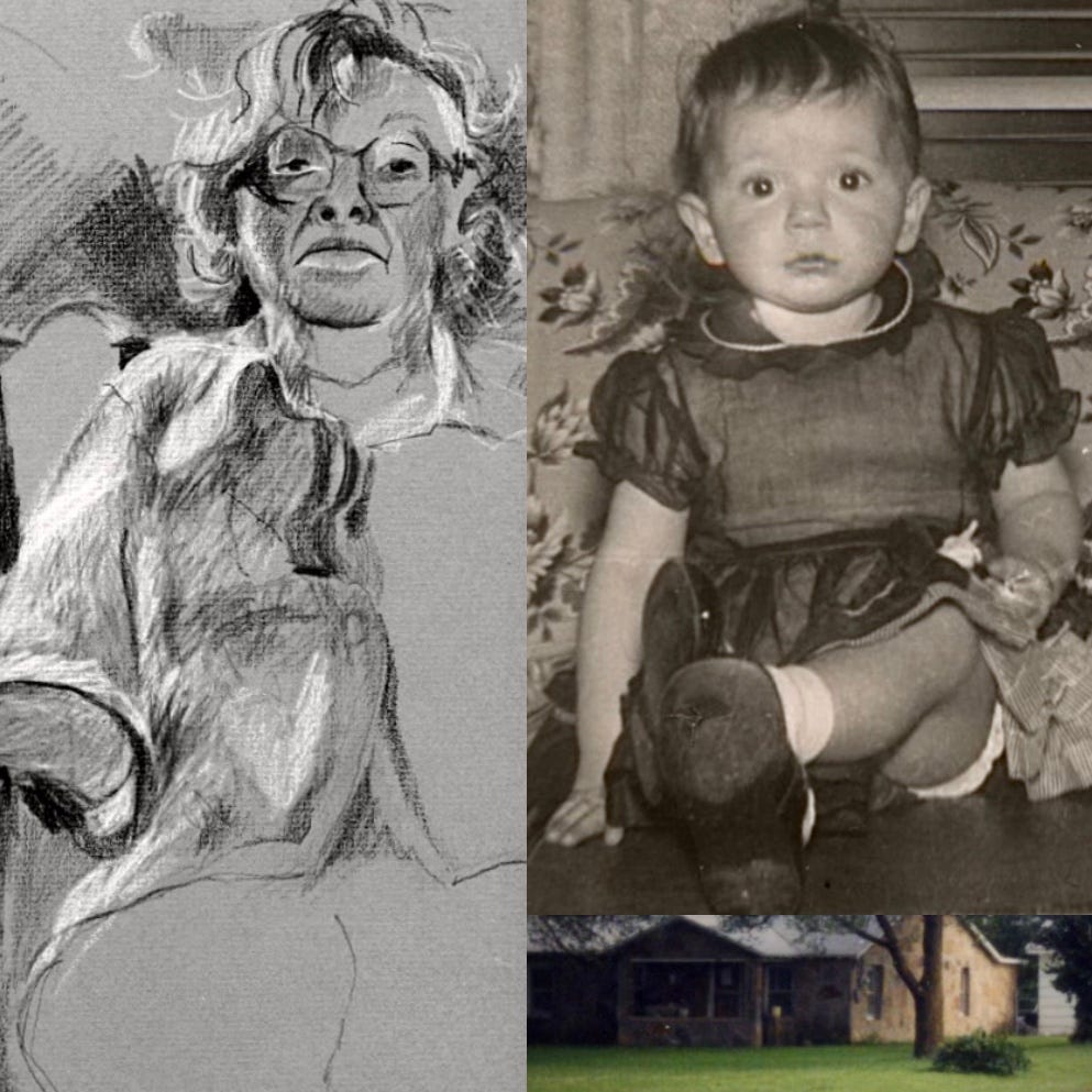 I paused to look more closely at a faded color photo of a young girl sitting in a flowered chair with a baby, its head round as a basketball, midget arms outstretched, open face smiling beside her own.